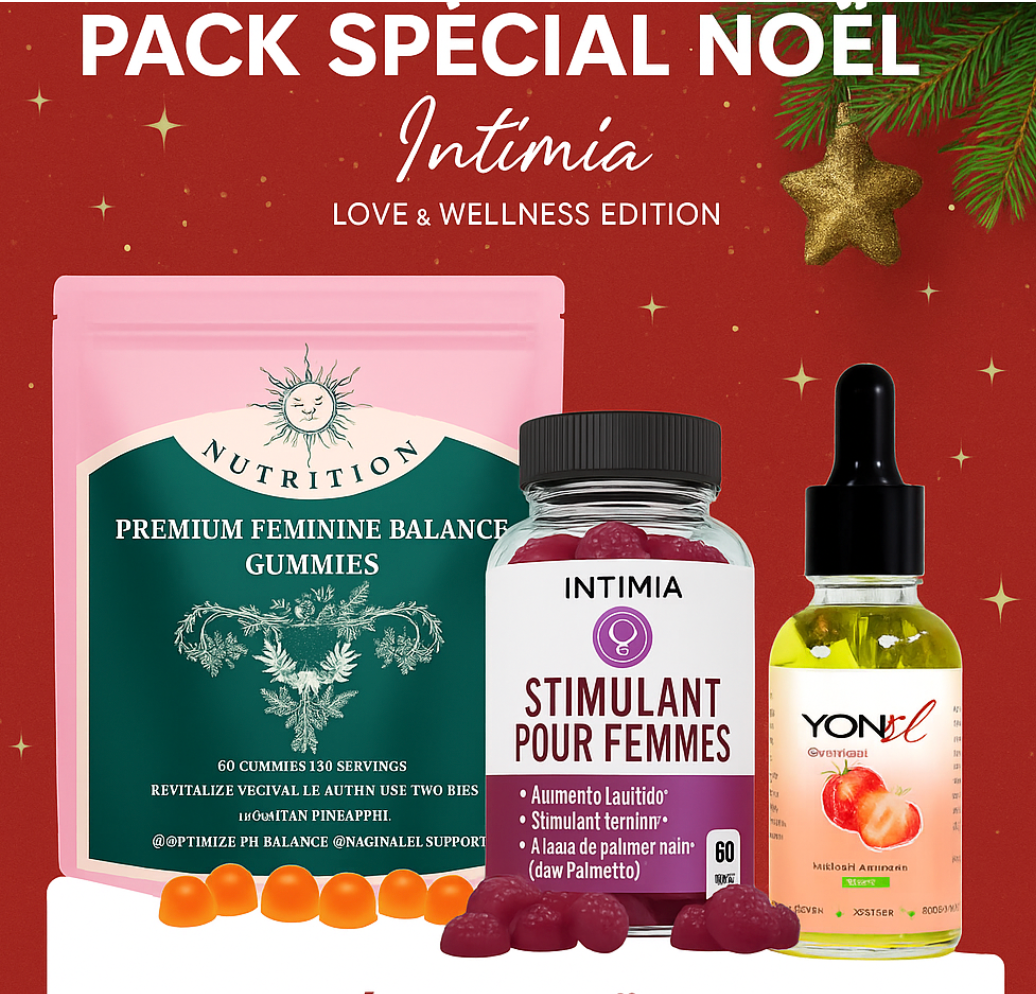 🎁 Pack Spécial Noël – Intimia Love & Wellness Edition 💗✨Offrez un Noël plein de douceur, de vitalité… et un vrai boost de confiance ✨Le trio parfait pour se sentir bien, rayonnante et équilibrée !💗 Dans votre pack :✔ Gummies Libido (60 gummies)Un coup de pouce naturel pour l’énergie intime et le bien-être féminin 💖✔ Huile Apaise, hydrate et laisse la peau douce… parfait pour une routine confort 🌸✔ Booster Libido Intimia Un concentré naturel pour réveiller la flamme et booster le plaisir ✨🔥🎄 Un cadeau irrésistible, magique… et 100% Intimia.